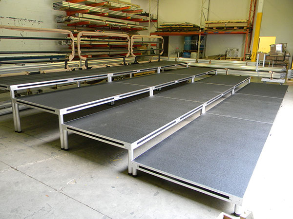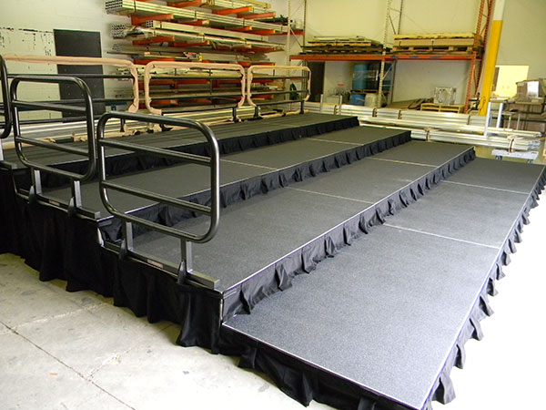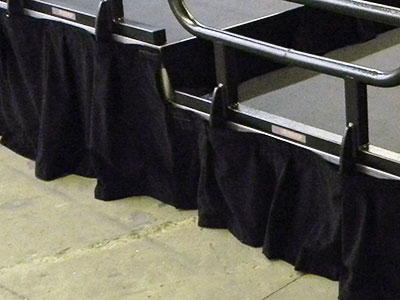 Stage skirting provides a finished look to any stage, as these “before” and “after” shots illustrate. UltraStage skirting is IFR rated and will not lose its fire rating after washing.