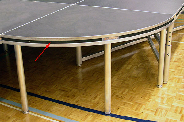 The RED arrow points to the recessed Velcro strip used to attach skirting to the decks. The recessed design protects the Velcro when decks are moved, and also ensures a snug fit when the skirting is attached to the stage.